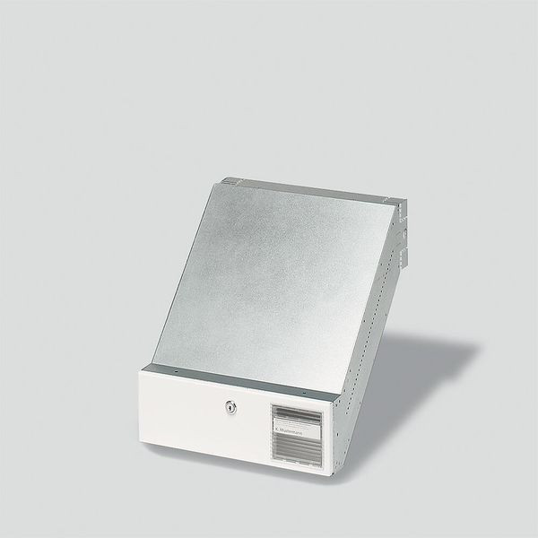 aus feuerverzinktem, 0,8 mm Stahlblech, ausziehbar von 290 bis 440 mm in schräger 45° Ausführung mit rückseitige Entnahmetür, Schließzylinder, Namensschild und Informationsfenster, nach unten aufgehend, Farbe Weiß lackiert nach RAL 9016, Durchwurf-Briefkasten nach DIN EN 13724