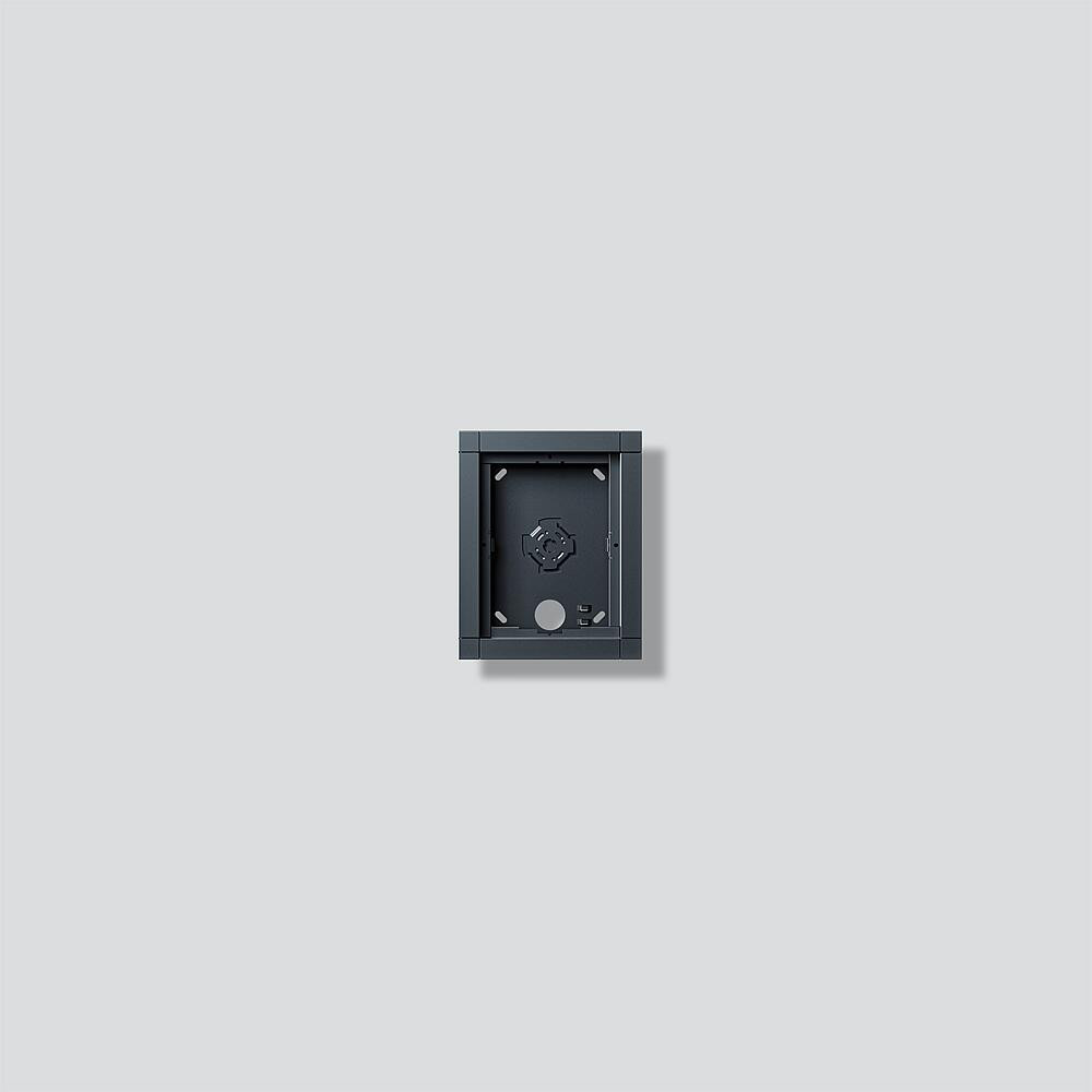 Aufputzgehäuse aus Aluminium-Strangpressprofil mit Zink-Druckguss-Eckverbindern und Stahlblechbodenplatte für 1 Funktionsmodul.