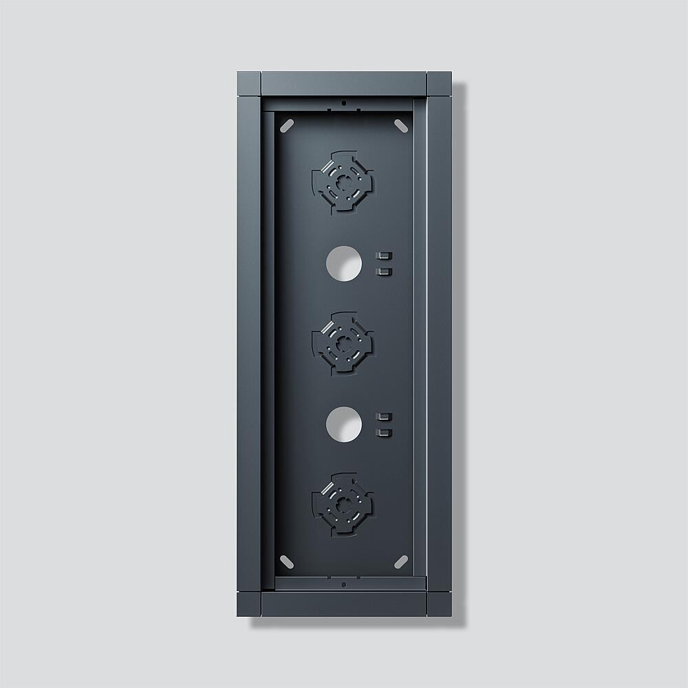 Aufputzgehäuse aus Aluminium-Strangpressprofil mit Zink-Druckguss-Eckverbindern und Stahlblechbodenplatte für 3 Funktionsmodule.