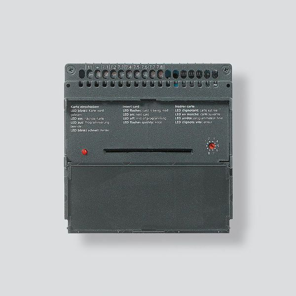 im 6-Raster-Schalttafelgehäuse, zum Umsetzen von codierten Rufen auf 8 Rufausgänge/ Teilnehmer. Bis zu 8 Türlautsprecher für Coderuf können an einem RC 602-… angeschlossen werden. Der Ruf wird über ein COM 611-… bzw. Display-Ruf-Modul DRM 611-... von einem Türlautsprecher ausgelöst. Dadurch können max. 504 Rufausgänge/ Teilnehmer angeschlossen werden.