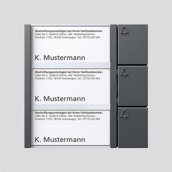 Tasten-Modul mit Namensschildtasche, 3 Namensschildern und 3 separaten Ruftasten mit Glockensymbol.