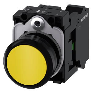Drucktaster, 22 mm, rund, Kunststoff, gelb, Druckknopf, flach, tastend, mit Halter 1S, Federzuganschluss Drucktaster SIRIUS ACT zur Schaltung und Steuerung elektrischer Verbraucher. Unter dem Markennamen SIRIUS ACT bietet Siemens ein einzigartiges Portfolio an Befehls- und Meldegeräten mit weltweiten Produkt-Zulassungen in drei modernen Designreihen aus robustem Echtmetall und hochwertigem Kunststoff. Das innovative Aufschnappkonzept vereinfacht die Montage so weit, dass dafür nur eine Hand und kein Spezialwerkzeug erforderlich ist. Als Montagebohrungen genügen nutfreie Löcher, da bereits ein 100%iger Verdrehschutz integriert ist. Dank der durchgängig hohen Schutzart sind die robusten Geräte industrietauglich und für den Außeneinsatz geeignet. Sogar die Reinigung mit Hochdruckstrahl ist möglich. Weder Staub, Öle noch aggressive Laugen können den zuverlässigen Betrieb stören. Neben der Standardverdrahtung können die meisten Geräte auch über PROFINET, AS-Interface oder IO-Link an die Steuerung angebunden werden. Damit reduzieren Sie Ihren Verdrahtungsaufwand, minimieren Fehlerquellen und gewinnen mehr Flexibilität. Komfortabel unterstützt der grafische Online-Konfigurator bei Auswahl und Bestellung von Einzelgeräten, Gehäusen und Beschriftungen. Umfangreiche Dokumentation (z.B. Handbuch, 3D-Daten, Anschlussdiagramm) ist verfügbar. Lieferbare Ausführungen: mehrere Farben, beleuchtet/unbeleuchtet, mit/ohne Beschriftung, verrastende/tastende Betätigung, verschiedene Druckknopf- und Frontringhöhen. Hinweis: Komplettgerät, Lieferung inklusive Halter und Module. SIRIUS ACT - Performance in Action beim Befehlen und Melden. Einfach montiert, einfach stark, einfach perfekt.