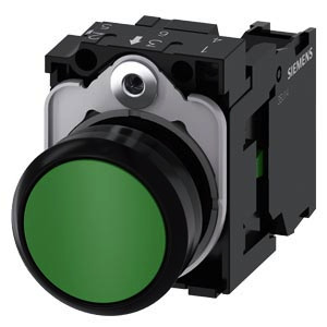 Drucktaster, 22 mm, rund, Kunststoff, grün, Druckknopf, flach, tastend, mit Halter 1S, Schraubanschluss Drucktaster SIRIUS ACT zur Schaltung und Steuerung elektrischer Verbraucher. Unter dem Markennamen SIRIUS ACT bietet Siemens ein einzigartiges Portfolio an Befehls- und Meldegeräten mit weltweiten Produkt-Zulassungen in drei modernen Designreihen aus robustem Echtmetall und hochwertigem Kunststoff. Das innovative Aufschnappkonzept vereinfacht die Montage so weit, dass dafür nur eine Hand und kein Spezialwerkzeug erforderlich ist. Als Montagebohrungen genügen nutfreie Löcher, da bereits ein 100%iger Verdrehschutz integriert ist. Dank der durchgängig hohen Schutzart sind die robusten Geräte industrietauglich und für den Außeneinsatz geeignet. Sogar die Reinigung mit Hochdruckstrahl ist möglich. Weder Staub, Öle noch aggressive Laugen können den zuverlässigen Betrieb stören. Neben der Standardverdrahtung können die meisten Geräte auch über PROFINET, AS-Interface oder IO-Link an die Steuerung angebunden werden. Damit reduzieren Sie Ihren Verdrahtungsaufwand, minimieren Fehlerquellen und gewinnen mehr Flexibilität. Komfortabel unterstützt der grafische Online-Konfigurator bei Auswahl und Bestellung von Einzelgeräten, Gehäusen und Beschriftungen. Umfangreiche Dokumentation (z.B. Handbuch, 3D-Daten, Anschlussdiagramm) ist verfügbar. Lieferbare Ausführungen: mehrere Farben, beleuchtet/unbeleuchtet, mit/ohne Beschriftung, verrastende/tastende Betätigung, verschiedene Druckknopf- und Frontringhöhen. Hinweis: Komplettgerät, Lieferung inklusive Halter und Module. SIRIUS ACT - Performance in Action beim Befehlen und Melden. Einfach montiert, einfach stark, einfach perfekt.