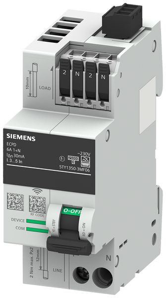 ECPD mit Mess- und Kommunikationsfunktion RCD Typ F 30mA In: 6A, Un: 230V AC, 75kA 1+N in 2TE Bitte Funkzulassung beachten! Länderliste: siehe Zertifikate Elektronisches Schutzschaltgerät SENTRON ECPD 5TY COM für den kombinierten Schutz vor Überlast, Kurzschluss und Fehlerströmen in nur 2 TE. Das multifunktionale und kommunikationsfähige elektronische Schutzschaltgerät 5TY bietet viele Vorteile in einem einzigen Gerät. Es ist ultraschnell, bis zu 1000 mal schneller als vergleichbare Geräte, impulsfest und selektiv für maximalen Schutz. Durch Parametrierung lässt sich das ECPD individuell konfigurieren und passt sich somit Ihrer Applikation an.Nachhaltigkeit neu gedacht: Die Kombination mehrerer Funktionen auf nur 2 TE spart Ressourcen und Kosten (z.B. 80% weniger Elektronik, 90% weniger Metall, 90% weniger Kunststoff). Auch in der umgebenden Applikation profitieren Sie von geringerem Energiebedarf, Materialeinsparungen (z.B. Kupfer) und vereinfachter Verdrahtung. Die elektronischen Schutzschaltgeräte 5TY sind in verschiedenen Stromstärken verfügbar. Das ECPD ist Bestandteil des kommunikationsfähigen SENTRON Portfolios und lässt sich ausschließlich mit SENTRON Powercenter 1100/2000 parametrieren. Zudem sind als Zubehör Sammelschienen, Einspeiseklemmen und eine Absperrvorrichtung erhältlich. SENTRON ECPD. All you need. And more.