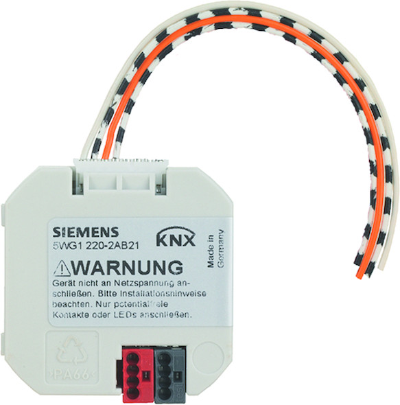 - 4 Ein-/Ausgänge jeweils einstellbar für potentialfreie Kontakte oder zur Ansteuerung von LED (max. 2 mA) - Integrierter Busankoppler, Busanschluss über Busklemme - Fest angeschlossener achtadriger Leitungssatz 280mm lang, verlängerbar bis auf max. 10 m - Einlegen in UP-Gerätedosen mit Durchmesser 60 mm und Tiefe 40 mm