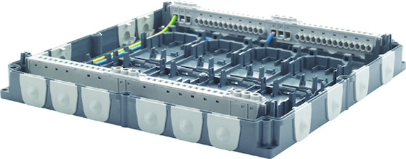 AP 641 8 Steckplätze für Raumautomations-Module Typ RS oder RL, interne Busleitung zum Anschlussder Raumautomations-Module an den Bus, getrennter Anschlussraum und Zugentlastung für Funktionsleitungen, zwei PE/N-Schienen zum Auflegen der PE und N-Leiter der Funktionleitungen, Busanschlussüber Busklemme, Einbaugerät mit Schraubbefestigung, zur Installation unter aufgeständerten Böden, auf der Wand, unter der Decke oder in Feuchträumen, Gehäuse aus Kunststoff, Abmessungen (L x B x H) 300 x 300 x 50 mm