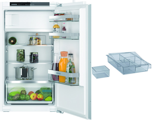 Einbau-Kühlschrank KI 32LVFE0: elektronische Temperaturregelung über LED ablesbar, freshSense: konstante Temperatur durch intelligente Sensortechnik, akustischer Türalarm, Kühlteil: autoAirflow, Super-Kühlen, LED-Beleuchtung, 3 Abstellflächen aus Sicherheitsglas, davon 2 höhenverstellbar, 1 freshBox mit Wellenboden; 4-Sterne-Gefrierfach: SuperGefrieren; Türanschlag rechts, wechselbar, Made in Germany