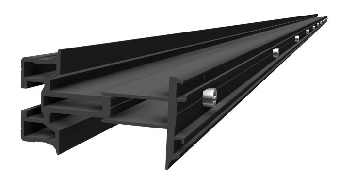 Fassadensystem Mitte, komplett vormontiertes Fassaden-/Einlegeprofil mitte, Länge 1790 mm für einzelne liegende Module bis 1790 mm Länge, Material Aluminium (Profil) und Edelstahl (Schrauben), Oberfläche schwarz eloxiert, schnelle und einfache Montage dank vormontierter Schiene, sichere Installation durch integrierten Potentialausgleich, effiziente Montage mit minimalem Werkzeugbedarf (TX40)