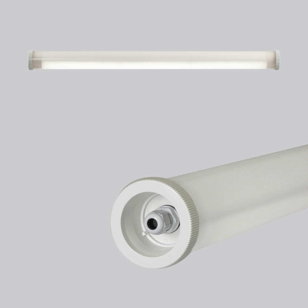 Schutzrohr Kunststoff (Polycarbonat) opal, schlagzäh. Endkappen aus Kunststoff (Polyamid) grau. Homogene, weiche und blendreduzierte Ausleuchtung. Betriebsgerät integriert. 1 Kabeleinführung. Ohne Durchgangsverdrahtung. Durch Zubehör (optional) für Wand-, Decken- und Pendelmontage geeignet. Zur Leuchte ist immer ein Montagezubehör mit zu bestellen. Leuchte mit begrenzter Oberflächentemperatur nach DIN EN 60598-2-24.