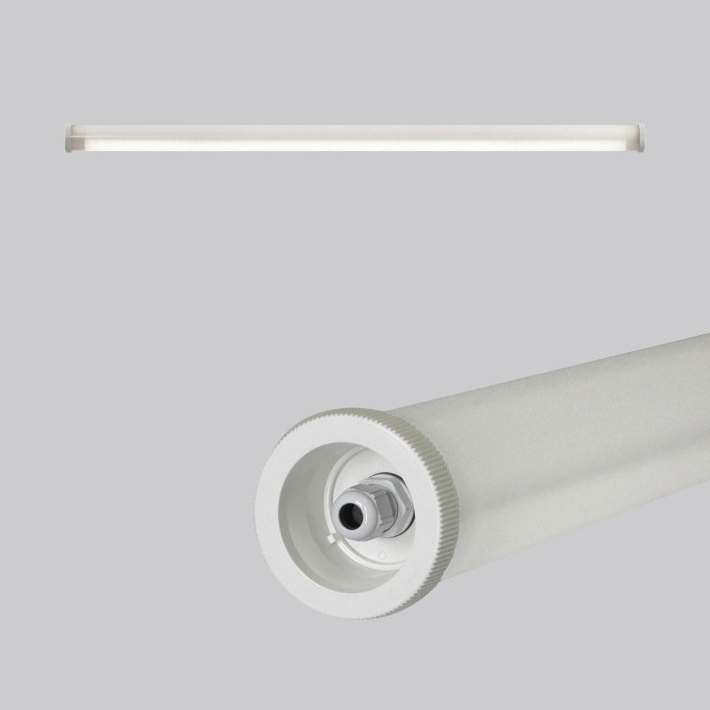 Schutzrohr Kunststoff (Polycarbonat) opal, schlagzäh. Endkappen aus Kunststoff (Polyamid) grau. Homogene, weiche und blendreduzierte Ausleuchtung. Betriebsgerät integriert. 2 Kabeleinführungen. Leuchte mit integrierter 3-poliger Durchgangsverdrahtung für das Aneinanderreihen von weiteren Leuchten. Durch Zubehör (optional) für Wand-, Decken- und Pendelmontage geeignet. Zur Leuchte ist immer ein Montagezubehör mit zu bestellen. Leuchte mit begrenzter Oberflächentemperatur nach DIN EN 60598-2-24.