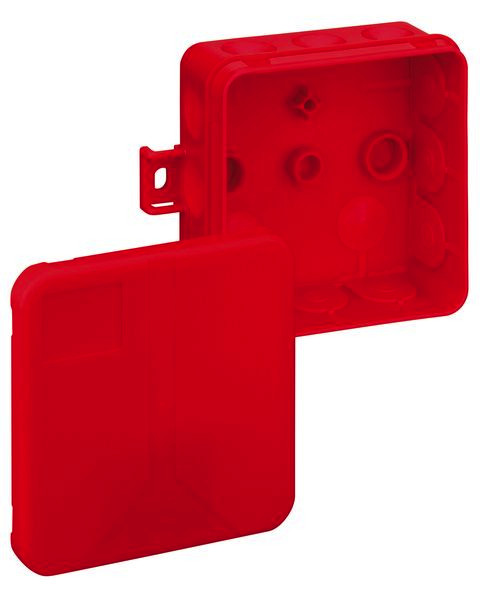 Abzweigdose, mit Schutzart IP55, Nennquerschnitt 2,5mm², Ui=400 V AC, zertifiziert durch VDE (DIN EN 60670-1/-22 (VDE 0606-1/-22)), selbstdichtende, weiche Einführungsmembranen, Dichtbereich 2-14mm, (2 rückseitig, 12 seitlich), außenliegende Befestigungsstellen, für Standardinstallationen im Innenbereich, rot, ohne Klemmen, zur Kennzeichnung von Stromkreisen der Sicherheitsbeleuchtung