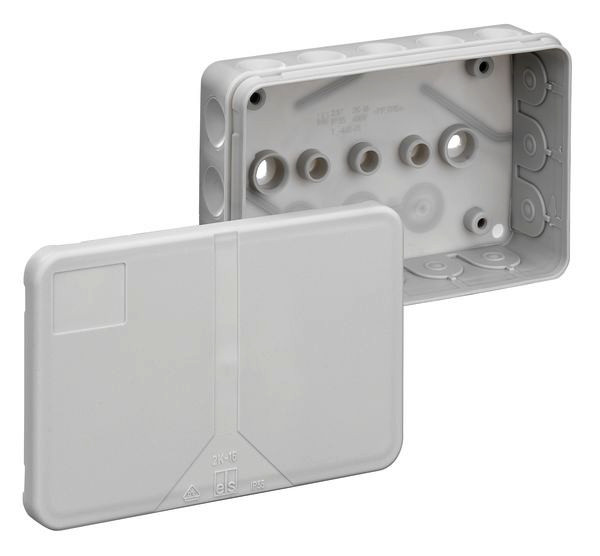 Abzweigdose, mit Schutzart IP55, Nennquerschnitt 2,5mm², Ui=400 V AC, zertifiziert durch VDE (DIN EN 60670-1/-22 (VDE 0606-1/-22)), selbstdichtende, weiche Einführungsmembranen, Dichtbereich 2-14mm, (3 rückseitig, 16 seitlich), innenliegende Befestigungsstellen, für Standardinstallationen im Innenbereich, grau, ohne Klemmen