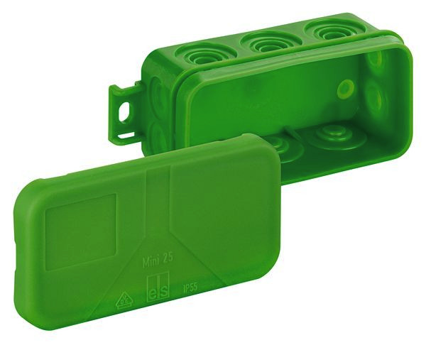Abzweigdose, mit Schutzart IP55, Nennquerschnitt 2,5mm², Ui=400 V AC, zertifiziert durch VDE (DIN EN 60670-1/-22 (VDE 0606-1/-22)), selbstdichtende Einführungsmembranen, Dichtbereich 8,2-12,5mm, (2 rückseitig, 10 seitlich), außenliegende Befestigungsstellen, für Standardinstallationen im Innenbereich, grün, ohne Klemmen