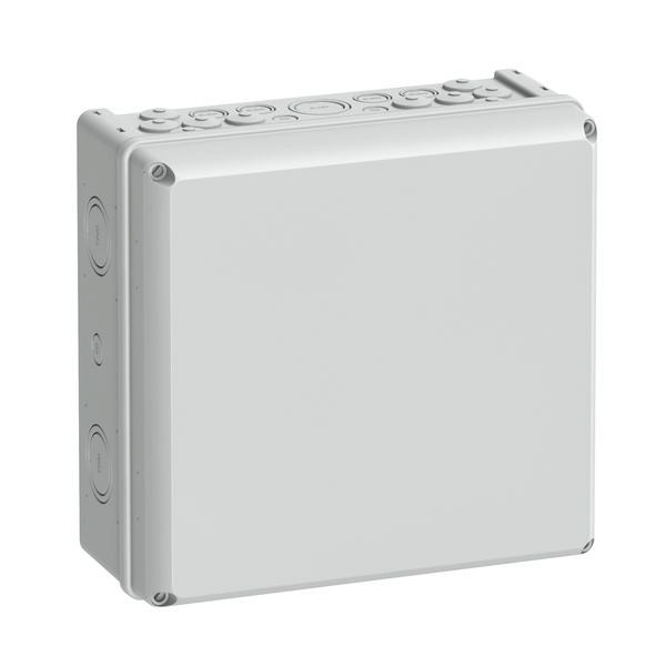 Leergehäuse, mit Schutzart IP65, Kunststoff, zertifiziert durch DLG (Ammoniakbeständigkeit), Ui=1000V AC, Ui=1500V DC, für Kleinverteiler AK 14-56 zum individuellen Ausbau mit Normschienen oder Montageplatte, Kasten: Kunststoff, grau, Deckel: Polycarbonat, grau, oben und unten metrische Vorprägungen für universelle Leitungseinführungen mit Kabelverschraubungen und / oder Doppelmembranstutzen, oben mit elastischen Einführungen DMS M20 vorbestückt