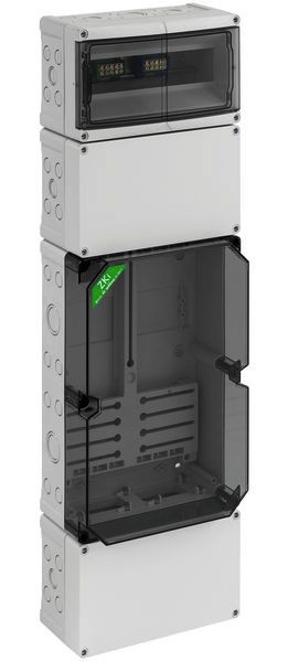 Zählergehäuse, mit transparentem Deckel, serienmäßig plombierbar, mit montiertem Zählerkreuz und Zählerbefestigungsschrauben, zusätzlicher Anschlussraum unten 150mm mit 35mm Normschiene, serienmäßig plombierbarer Konsumentenraum oben, mit 35mm Normschiene und PE/N-Doppelklemmen, Zusatzraum mit 35mm Normschiene, mit Doppelmembranstutzen, Verschluss- und Isolierstopfen, geeignet für Rundsteuerempfänger nach DIN 43861-2, für Zähler mit Drei-Punkt-Befestigung und einer Tiefe von max. 80mm