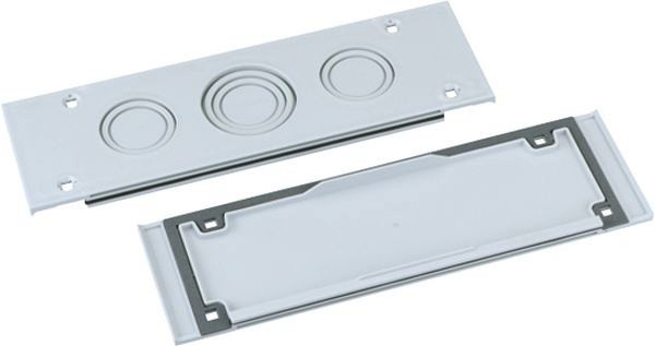 2 x M32/ M40/ M50, 1 x M40/ M50/ M63 Anbauflansch, zum Anbau an 300mm breite Stirnseiten von AKL / AKi-L Leergehäusen, AKi Schalter- und Sicherungsgehäusen, AKi Steckdosenverteiler, AKi-Z / ZVi Zählergehäusen, komplett mit Befestigungsmaterial, mit Vorprägung, 2 x M32 / M40 / M50, 1 x M40 / M50 / M63
