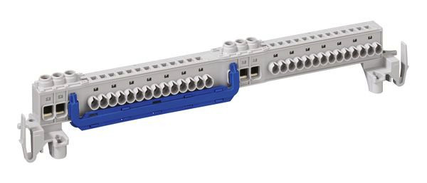 Schraubenlose PE/N Klemmschiene, zum Einbau in AK Kleinverteiler ab AK 14 und AKL/AKi-Leergehäuse als zusätzliche Klemmen oder für Ersatzbedarf, einstufige N-Klemmschiene, mit 4 schraubbaren Klemmstellen 2,5mm²-16mm², und 28 schraubenlosen Klemmstellen 1,5mm²-4mm², Nach Entfernung der Querverbindung Aufteilung in, 2 N-Potentiale mit jeweils 3 schraubbaren Klemmstellen, 2,5mm²-16mm² und 14 schraubenlosen, Klemmstellen 1,5mm²-4mm²