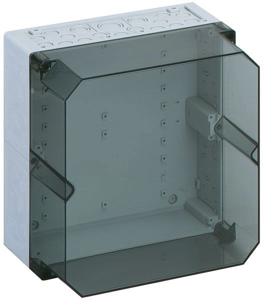 Leergehäuse, mit Schutzart IP65, Polystyrol, Ui=690V AC, Ui=1000V DC, innenliegende Befestigungsstellen, für Standardinstallationen im Innenbereich, Kasten: Polystyrol, Deckel: Polycarbonat, transparent, Ausschlagmembranen, M20/M25/M32/M40, (56 seitlich)