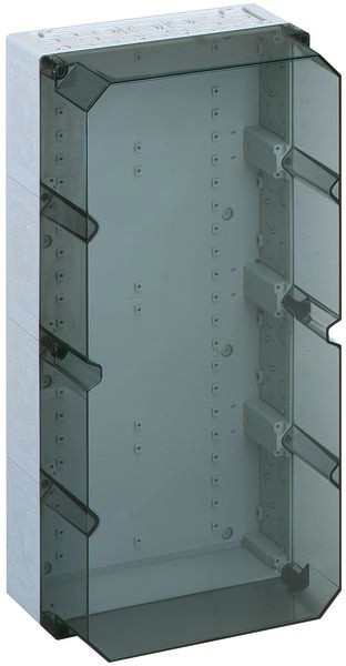 Leergehäuse, mit Schutzart IP65, Polycarbonat, glasfaserverstärkt, Ui=690V AC, Ui=1000V DC, innenliegende Befestigungsstellen, für Installationen im industriellen Umfeld und geschütztem Außenbereich, Kasten: Polycarbonat, glasfaserverstärkt, Deckel: Polycarbonat, transparent, Ausschlagmembranen, M20/M25/M32/M40, (76 seitlich)