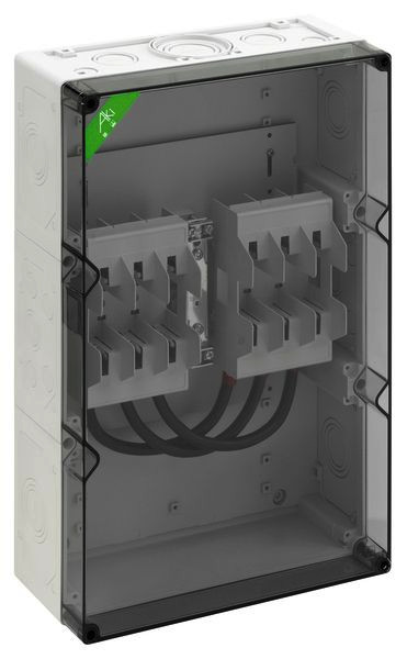 NH-Sicherungsgehäuse, 2 x NH 00-Sicherungsunterteil, montiert auf Montageplatte, Bemessungsstrom 100 A, Schellenanschluss 1,5-70mm², N-Klemme 2 x 50mm², 2 Kabelverschraubungen M40, 1 Kabelverschraubung M50, mit Isolierstopfen, mit transparentem Deckel