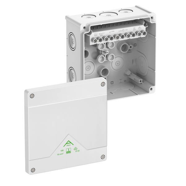 Abzweigkasten, mit Schutzart IP66, Nennquerschnitt 10mm², zertifiziert durch VDE (DIN EN 60670-1/-22 (VDE 0606-1/-22)), DLG (Ammoniakbeständigkeit), selbstdichtende, weiche Einführungsmembranen, M20/M25/M32, Dichtbereich 8-28mm, (2 rückseitig, 10 seitlich), innenliegende Befestigungsstellen, für Standardinstallationen im Innenbereich und geschütztem Außenbereich, weiß, Ui=690 V AC, In=57 A, mit hochliegender Schraubklemme, 5-polig, max. Nennquerschnitt nach DIN EN 60998: 10mm², klemmbare Querschnitte pro Pol: 4 x 2,5mm², 4 x 4mm², 4 x 6mm², 4 x 10mm², 2 x 16mm² Cu starr / flexibel mit Aderendhülse