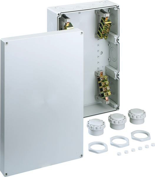 Abzweigkasten, mit Schutzart IP54/IP65, Nennquerschnitt 70mm², Ui=690 V AC, Ausschlagmembranen, M20/M32/M40/M50/M63, (16 seitlich), innenliegende Befestigungsstellen, für Standardinstallationen im Innenbereich, grau, mit Schraubklemme, 4-polig-70² (16-70²)