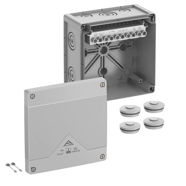 Abzweigkasten, mit Schutzart IP66/IP67/IP69, Nennquerschnitt 10mm², zertifiziert durch VDE (DIN EN 60670-1/-22 (VDE 0606-1/-22)), DLG (Ammoniakbeständigkeit), DNV (Klasse: Schiffe & Offshore-Anlagen), Ausschlagmembranen, M20/M25/M32, (2 rückseitig, 10 seitlich), innenliegende Befestigungsstellen, für Installationen im industriellen Umfeld und ungeschütztem Außenbereich, grau, Ui=690 V AC, In=57 A, mit hochliegender Schraubklemme, 5-polig, max. Nennquerschnitt nach DIN EN 60998: 10mm², klemmbare Querschnitte pro Pol: 4 x 2,5mm², 4 x 4mm², 4 x 6mm², 4 x 10mm², 2 x 16mm² Cu starr / flexibel mit Aderendhülse