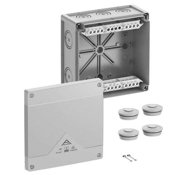Abzweigkasten, mit Schutzart IP66/IP67/IP69, Nennquerschnitt 16mm², zertifiziert durch VDE (DIN EN 60670-1/-22 (VDE 0606-1/-22)), DLG (Ammoniakbeständigkeit), DNV (Klasse: Schiffe & Offshore-Anlagen), Ausschlagmembranen, M20/M32/M40, (2 rückseitig, 10 seitlich), innenliegende Befestigungsstellen, für Installationen im industriellen Umfeld und ungeschütztem Außenbereich, grau, Ui=690 V AC, In=76 A, mit hochliegender Schraubklemme, 5-polig-16mm², klemmbare Querschnitte pro Pol: 12 x 4mm², 8 x 6mm², 4 x 10mm², 4 x 16mm² Cu starr / flexibel mit Aderendhülse