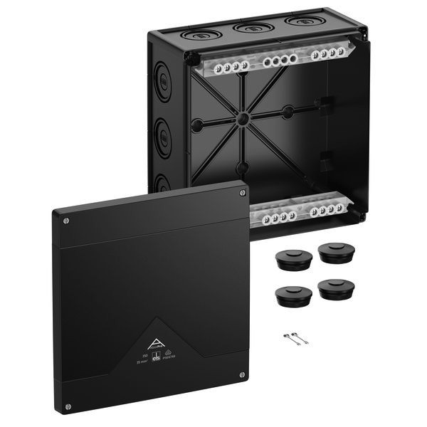 Abzweigkasten, mit Schutzart IP66/IP67/IP69, Nennquerschnitt 35mm², zertifiziert durch VDE (DIN EN 60670-1/-22 (VDE 0606-1/-22)), DLG (Ammoniakbeständigkeit), DNV (Klasse: Schiffe & Offshore-Anlagen), Ausschlagmembranen, M20/M25/M40/M50, (4 rückseitig, 12 seitlich), innenliegende Befestigungsstellen, für Installationen im industriellen Umfeld und ungeschütztem Außenbereich, schwarz, Ui=690 V AC, In=125 A, mit hochliegender Schraubklemme, 5-polig-35mm², klemmbare Querschnitte pro Pol: 12 x 10mm², 8 x 16mm², 4 x 25mm². 4 x 35mm² Cu starr / flexibel mit Aderendhülse