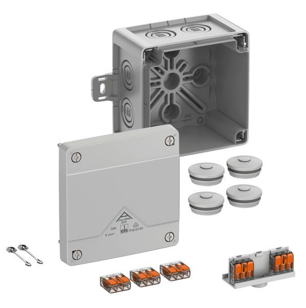 Abzweigkasten, mit Schutzart IP66/IP67/IP69, Nennquerschnitt 4mm², Ui=450 V AC, zertifiziert durch VDE (DIN EN 60670-1/-22 (VDE 0606-1/-22)), DLG (Ammoniakbeständigkeit), DNV (Klasse: Schiffe & Offshore-Anlagen), Ausschlagmembranen, M16/M20/M25, (1 rückseitig, 7 seitlich), innenliegende Befestigungsstellen, mit schraubenlosen Klemmen und Klemmenhalter, für Installationen im industriellen Umfeld und ungeschütztem Außenbereich, grau, In=32 A, mit 5 bodenfixierten, schraubenlosen 3-Leiter-Klemmen Wago 221-413-4mm², klemmbare Querschnitte pro Pol: 3 x 0,2 bis 4mm² starr Cu und 3 x 0,14 bis 4mm² flexibel Cu