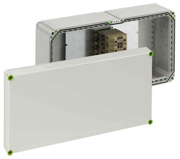 Abzweigkasten, mit Schutzart IP65, Nennquerschnitt 240mm², Ui=690 V AC, Ausschlagmembranen, M16/M40/M50, (30 seitlich), innenliegende Befestigungsstellen, für Installationen im industriellen Umfeld und geschütztem Außenbereich, grau, mit Reihenklemme 5-polig-240² (70 bis 240mm²)