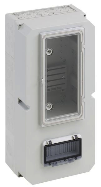 Zählergehäuse, Deckel grau, serienmäßig plombierbar, mit transparentem Klappfenster, mit montiertem Zählerkreuz für Drehstromzähler und Zählerbefestigungsschrauben, mit zusätzlichem Klappfenster zur Bedienung eines selektiven Hauptschalters, inkl. 2 einpoligen HA-Klemmen 25/16mm² für N und PE, mit 35mm Normschiene zum Einbau eines selektiven Hauptschalters, mit Doppelmembranstutzen, Verschluss- und Isolierstopfen,