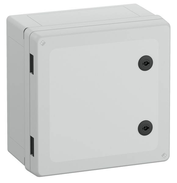 Schaltschrank, geeignet für die Installation in rauen Umgebungen und im ungeschützten Außenbereich, Kasten und Rahmen: glasfaserverstärktes Polycarbonat, grau, ähnlich RAL 7035, Tür: Polycarbonat.
