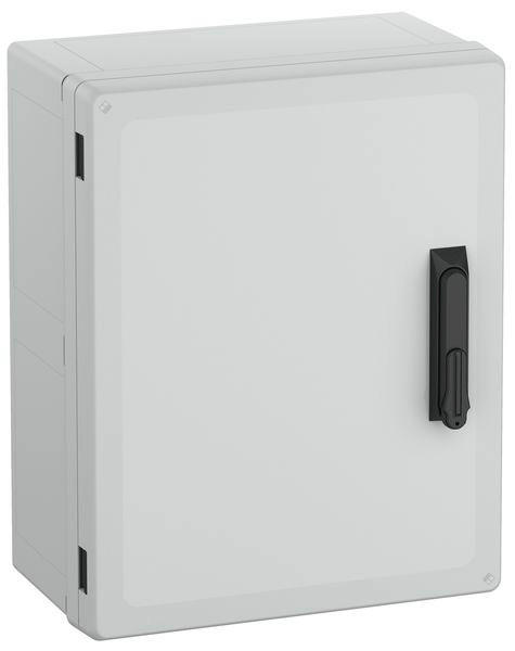 Schaltschrank, geeignet für die Installation in rauen Umgebungen und im ungeschützten Außenbereich, Kasten und Rahmen: glasfaserverstärktes Polycarbonat, grau, ähnlich RAL 7035, Tür: Polycarbonat.