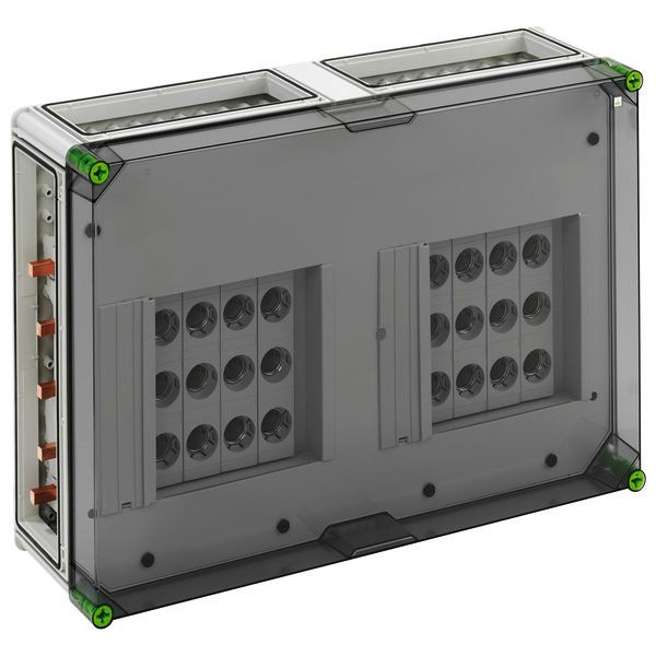 DIAZED(R)-Reiter-Sicherungsgehäuse mit zusätzlichem Anschlussraum, 8 x 3-polige DII-Reiter-Sicherungssockel, E 27-Gewinde, Bemessungsstrom 25 A, Schraubanschluss 1,5-25mm², auf Sammelschiene 5-polig, mit 5 Sammelschienenklemmen 16-70mm², N-Klemmen 1,5-16mm², PE-Klemmen 1,5-16mm², 4 x Gehäuseverbinder (GGV), auf Sammelschienensystem 250 A, mit transparentem Deckel