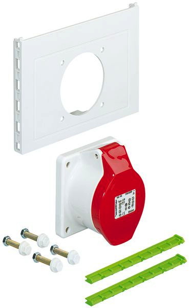 Kurzbeschreibung Steckdosenflansch, Schutzart IP44, Schlagfestigkeit IK08, Schutzklasse II, halogenfrei