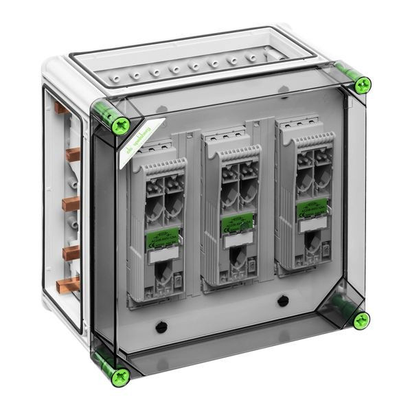 NH-Reiter-Sicherungs-Lasttrennschaltergehäuse, 3 x NH 000-Reiter-Sicherungs-Lasttrennschalter, Fahrstuhlklemme 1,5-50mm², Abgang unten, auf Sammelschiene 5-polig, mit 5 Sammelschienenklemmen zum direkten Anschluss eines Kabels an das Sammelschienensystem, zusätzliche N- und PE-Klemme für jeden Trennschalter, 3 x Gehäuseverbinder (GGV), Sammelschienensystem 250 A, mit transparentem Deckel
