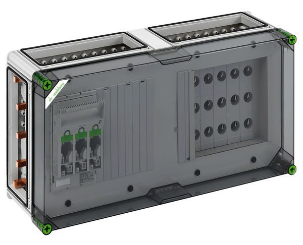 Kombi-Reitergehäuse, 1 x NH 00-Reiter-Sicherungs-Lasttrennschalter, Schellenanschluss 1,5-50mm², Abgang universal, 5 x 3-polige D02-Reiter-Sicherungssockel, E 18-Gewinde, Schraubanschluss 1,5-25mm², auf Sammelschiene 5-polig, mit 5 Sammelschienenklemmen zum direkten Anschluss eines Kabels an das Sammelschienensystem, zusätzliche N- und PE-Klemme für jeden Trennschalter, 4 x Gehäuseverbinder (GGV), Sammelschienensystem 630 A, mit transparentem Deckel