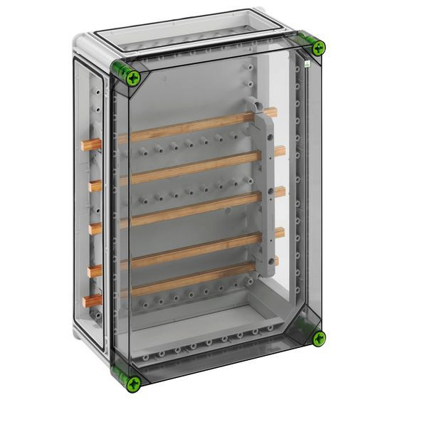 Sammelschienengehäuse mit zusätzlichem Anschlussraum, Sammelschienensystem, 5-polig, ohne Klemmen, zur individuellen Bestückung, mit transparentem Deckel, 3 x Gehäuseverbinder (GGV), mit Sammelschienensystem 5-polig 250A, mit CU-Schienen, L1...L3: 12 x 10mm, N: 12 x 10mm, PE: 12 x 10mm