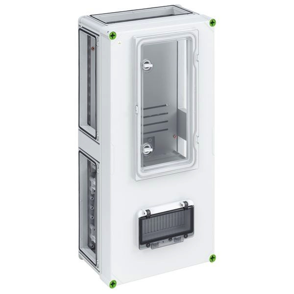 Zählergehäuse, serienmäßig plombierbar, mit Zählertragplatte und Zählerbefestigungsschrauben, für mechanische Elektrizitätszähler (Induktionszähler), für elektronische Haushaltszähler mit BKE-A Adapter, 4 x Gehäuseverbinder (GGV), mit grauem Deckel und zwei zusätzlichen Klappfenstern