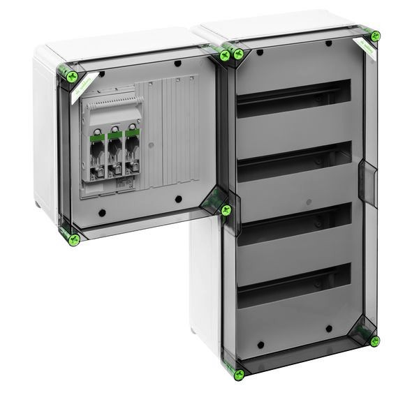 , bestehend aus NH-Reiter-Sicherungs-Lasttrennschaltergehäuse GST 2015-250, Automatengehäuse GTA 456-H-t, Flanschen mit metrischen Vorprägungen, zum Einbau von max. 18 Leitungsschutzschaltern (1-phasig) für Wechselrichter bis max. 6,4 kVA oder 6 Leitungsschutzschaltern (3-phasig) für Wechselrichter bis max. 19,3 kVA