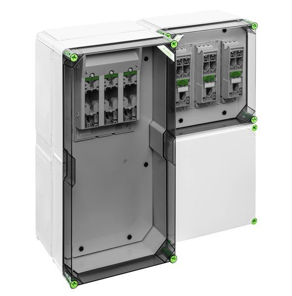 , NH1-Reiter-Sicherungs-Lasttrennschaltergehäuse GST 4116-250, NH000-Reiter-Sicherungs-Lasttrennschaltergehäuse GST 2335-250, Flanschen mit metrischen Vorprägungen, zum Anschluss von 3 Wechselrichtern (3-phasig) bis max. 140 kVA Gesamtleistung
