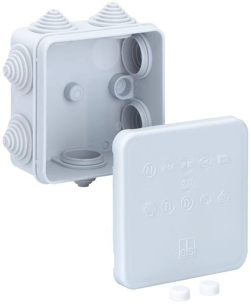 Abzweigdose, mit Schutzart IP55, Nennquerschnitt 2,5mm², Ui=400 V AC, zertifiziert durch VDE (DIN EN 60670-1/-22 (VDE 0606-1/-22)), Stufennippel, M20, Dichtbereich 5-16mm, (1 rückseitig, 7 seitlich), innenliegende Befestigungsstellen, für Standardinstallationen im Innenbereich, grau, ohne Klemmen