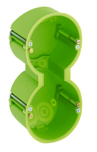Hohlwand-Gerätedoppeldose, flammwidrig, für Plattenstärken 1-40mm, mit Lochwerkzeug, Geräteschraubenabstand 60mm, mit geschlossenen Membran-Einführungen, Bohrloch Ø 2 x 68mm, 50mm tief, Kombinationsabstand 71mm