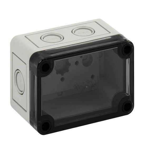 m = metrisch, o = ohne Vorprägung, tv = mit angespritzter Kabelverschraubung Leergehäuse, mit Schutzart IP66, Polycarbonat, glasfaserverstärkt, zertifiziert durch UL (UL 508 & CSA C22.2 No. 14-13, UL 50 & CSA 22.2 No. 94.1-7 & UL 50E & CSA C22.2 No. 94.2-7), DLG (Ammoniakbeständigkeit), DNV (Klasse: Schiffe & Offshore-Anlagen), Ui=690V AC, Ui=1000V DC, innenliegende Befestigungsstellen, für Installationen im industriellen Umfeld und geschütztem Außenbereich, Kasten: Polycarbonat, glasfaserverstärkt, grau, Deckel: Polycarbonat, transparent, Ausschlagmembranen, M16/M20, (6 seitlich)