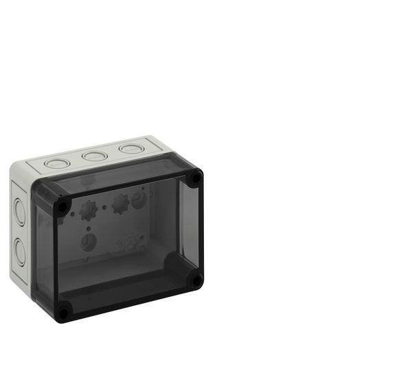 m = metrisch, o = ohne Vorprägung Leergehäuse, mit Schutzart IP66, Polystyrol, Ui=690V AC, Ui=1000V DC, innenliegende Befestigungsstellen, für Standardinstallationen im Innenbereich, Kasten: Polystyrol, grau, Deckel: Polycarbonat, transparent, Ausschlagmembranen, M16/M20, (10 seitlich)