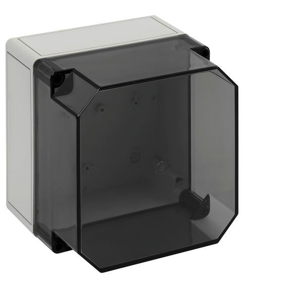 m = metrisch, o = ohne Vorprägung Leergehäuse, mit Schutzart IP66, Polystyrol, Ui=690V AC, Ui=1000V DC, innenliegende Befestigungsstellen, für Standardinstallationen im Innenbereich, Kasten: Polystyrol, grau, Deckel: Polycarbonat, transparent, glatte Seitenwände