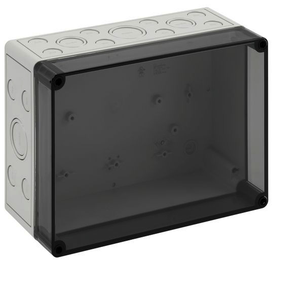 m = metrisch, o = ohne Vorprägung Leergehäuse, mit Schutzart IP66, Polystyrol, Ui=690V AC, Ui=1000V DC, innenliegende Befestigungsstellen, für Standardinstallationen im Innenbereich, Kasten: Polystyrol, grau, Deckel: Polycarbonat, transparent, Ausschlagmembranen, M20/M25/M32/M40, (32 seitlich)