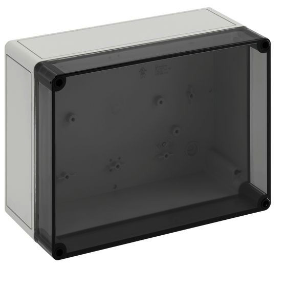 m = metrisch, o = ohne Vorprägung Leergehäuse, mit Schutzart IP66, Polystyrol, Ui=690V AC, Ui=1000V DC, innenliegende Befestigungsstellen, für Standardinstallationen im Innenbereich, Kasten: Polystyrol, grau, Deckel: Polycarbonat, transparent, glatte Seitenwände