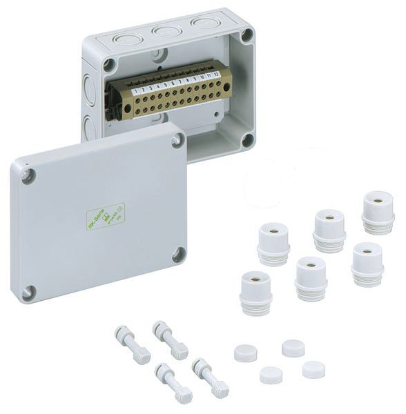 Reihenklemmengehäuse, mit Schutzart IP54/IP66, Nennquerschnitt 4mm², Ui=400V AC, Polystyrol, innenliegende Befestigungsstellen, für Standardinstallationen im Innenbereich, bestückt mit 15-polige Blockklemme 4mm² (Typ Contaclip BKA 4)